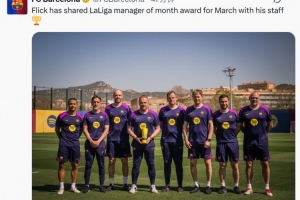 3月联赛3战全胜!弗里克与教练团队领取西甲官方3月最佳教练奖