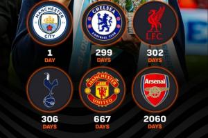 BIG6多久没拿重要冠军了?阿森纳2060天,曼联667天,热刺306天
