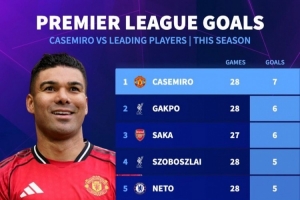 卡塞米罗本赛季英超打进7球,多于萨卡、萨拉赫、维尔茨等球员